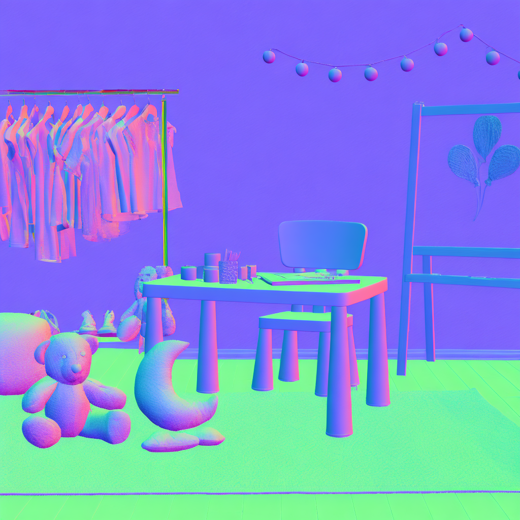 | Input image | Normal (Zhu et al. 2022b) | Normal (PVT-normal) | Normal (Ours RGB→X) seed 0 | Normal (Ours RGB→X) seed 1 | Normal (Ours RGB→X) seed 2 | Normal (Ours RGB→X) seed 3 | Normal (Ours RGB→X) seed 4 |