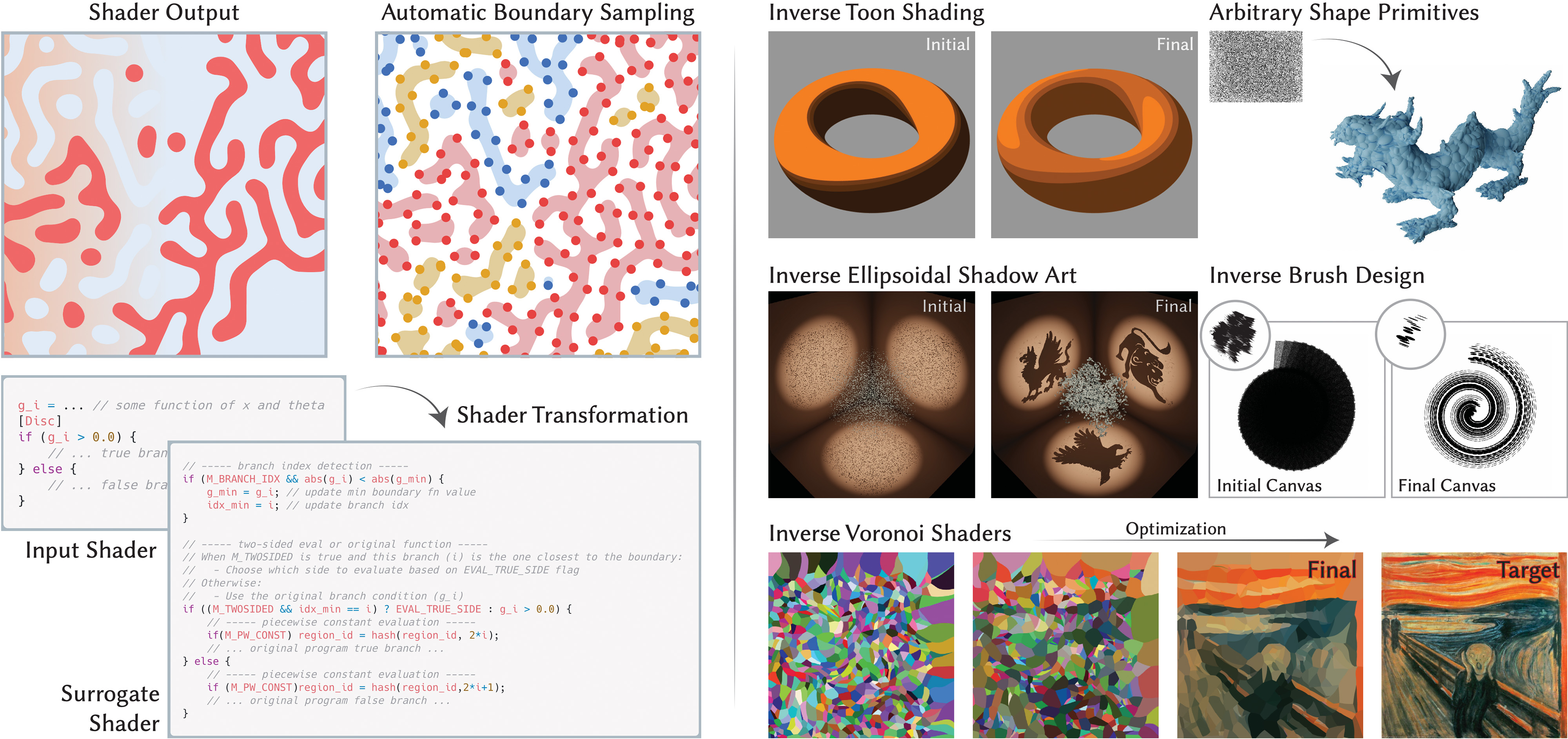 We present a novel method to differentiate integrals of discontinuous functions, which are common in inverse graphics, computer vision, and machine learning applications. Previous methods either require specialized routines to sample the discontinuous boundaries of predetermined primitives, or use reparameterization techniques that suffer from high variance. In contrast, our method handles general discontinuous functions, expressed as shader programs, without requiring manually specified boundary sampling routines. We achieve this through a program transformation that converts discontinuous functions into piecewise constant ones, enabling efficient boundary sampling through a novel segment snapping technique, and accurate derivatives at the boundary by simply comparing values on both sides of the discontinuity. Our method handles both explicit boundaries (polygons, ellipses, Bézier curves) and implicit ones (neural networks, noise-based functions, swept surfaces). We demonstrate that our system supports a wide range of applications, including painterly rendering, raster image fitting, constructive solid geometry, swept surfaces, mosaicing, and ray marching.